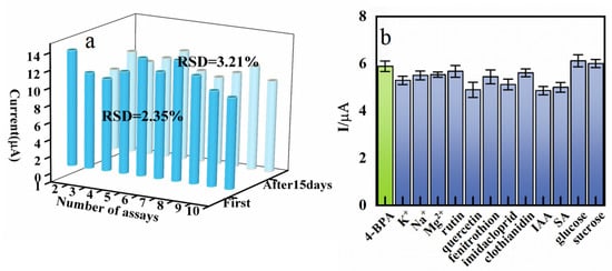 The repeatability of the CeO2/eGr/GCE was carried out with 10 µmol L−1 4-BPA by means of LSV (Supporting information, Figure S7). After 10 continuous measurements (Figure 6a), the relative standard deviation (RSD) of the oxidation peak currents was found to be 2.35% for 4-BPA. After storing the electrode at 4 °C for 15 days, the electroactive oxidation currents of 4-BPA reduced 3.21% compared to the original value. These results indicate that the proposed sensor has good stability and repeatability.