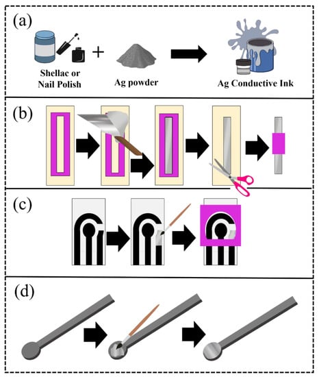 Ag inks proposed in this work were prepared using two groups of compositions with colorless nail polish (Cora®, Serrana, São Paulo, Brazil) and shellac (Acrilex®, São Bernardo do Campo, São Paulo, Brazil), and Ag powder. In this sense, eight ink compositions were created using these polymers. However, only one composition of each polymer was selected to continue the tests. To prepare the nail polish (NP) and silver ink (Ag-NP ink), 0.5 g of Ag powder (Dinâmica Química Contemporânea®, Indaiatuba, São Paulo, Brazil) was mixed in a double asymmetric centrifuge SpeedMixer™ Dac 150.1 FVZ-K (FlackTec Inc., Landrum, SC, USA), with 0.5 g NP in the ratio of 1:1 (w/w). Furthermore, to prepare the shellac (SL) and silver ink (named Ag-SL ink), 0.6 g of silver was mixed with 0.4 g of shellac in the ratio of 3:2 (w/w).