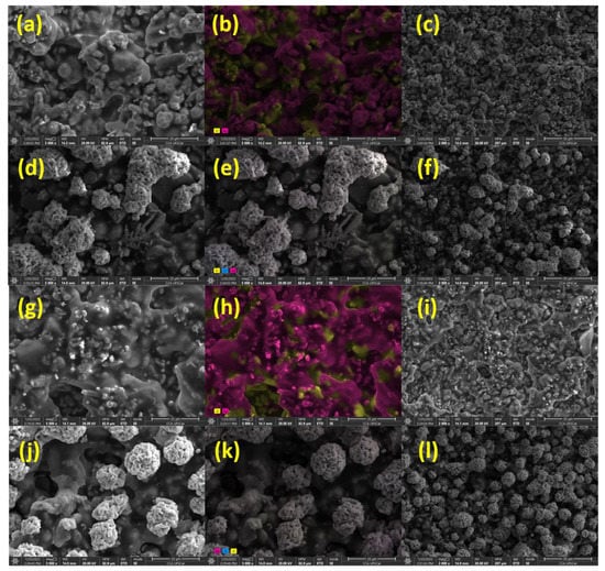 (a) SEM images obtained for Ag-NP ink at 5000× magnification; (b) ColorSEM mapping of Ag-NP ink 5000× magnification; (c) and Ag-NP ink at 2000× magnification; (d) Ag-NP ink with AgCl deposited at 5000× magnification; (e) ColorSEM mapping of Ag-NP ink with AgCl deposited at magnification 5000×; (f) and Ag-NP ink with AgCl deposited at 2000× magnification; (g) Ag-SL ink at 5000× magnification; (h) ColorSEM mapping of Ag-SL ink (magnification 5000×); (i) and Ag-SL ink in 2000×; (j) Ag-SL ink with AgCl deposited at 5000× magnification; (k) ColorSEM mapping of the Ag-SL ink with AgCl deposited at 5000× magnification; (l) and Ag-SL ink with AgCl deposited at 2000× magnification.