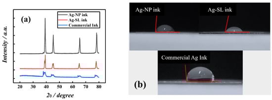 (a) X-ray spectrum of conductive silver inks. (b) The contact angle for Ag-NP (86°), Ag-SL (79°), and commercial (99°) inks spread on acetate sheets.