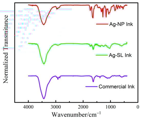 FTIR spectrum obtained for Ag-NP ink, Ag-SL ink, and Commercial Ink.