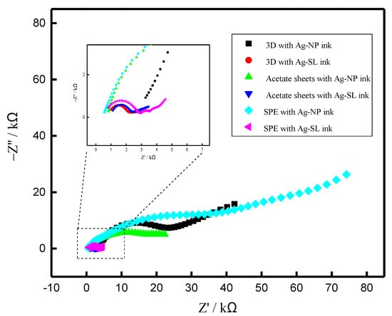 Nyquist diagrams for (black) 3D with Ag-NP ink; (red) 3D with Ag-SL ink; (green) acetate sheets with Ag-NP ink; (blue) Acetate sheets with Ag-SL ink; (cyan) SPE with Ag-NP ink and (pink) SPE with Ag-SL ink. The experiments were carried out using a solution of 1.0 mmol L−1 [Fe(CN6)]3−/4− and 0.1 mol L−1 KCl, as redox probe and supporting electrolyte and E = 0.1 V.