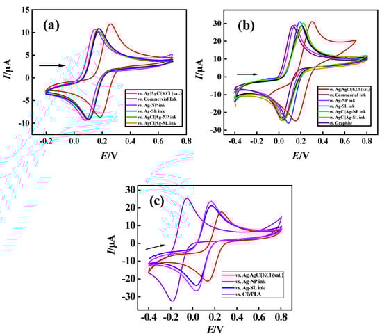 The cyclic voltametric response obtained for 1.0 mmol L−1 [Fe(CN)6]3−/4−varying reference electrode. (a) GCE vs. (red line) Ag|AgCl|KCl(sat.); (black) commercial ink; (pink) Ag-NP ink; (blue) Ag-SL ink; (green) AgCl|Ag-NP ink; and (orange) AgCl|Ag-SL ink. (b) GP-SL/AC vs. (red line) Ag|AgCl|KCl(sat.); (black) commercial ink; (pink) Ag-NP ink; (blue) Ag-SL ink; (green) AgCl|Ag-NP ink; (orange) AgCl|Ag-SL ink; and (purple) graphite ink. (c) 3D-printed CB/PLA vs. (red line) Ag|AgCl|KCl(sat.); (black) commercial ink; (pink) Ag-NP ink; (blue) Ag-SL ink; (purple) CB/PLA; using 0.1 mol L−1 KCl as supporting electrolyte scan rate: 50 mV s−1.