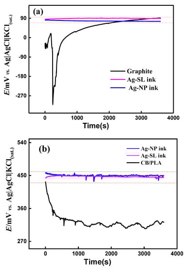 OCP measurements recorded for (a) GP-SL/AC system using graphite-SL, Ag-SL ink, and Ag-NP ink as working electrodes and (b) 3D-printed CB/PLA system, using CB/PLA, Ag-SL ink, and Ag-NP ink as the working electrode. In both systems Ag|AgCl|KCl(sat.) was used as the reference electrode and 0.1 mol L−1 KCl solution as the supporting electrolyte.