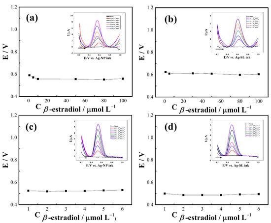 Potential (V) vs. concentration plot of the developed silver inks for GP-SL/Ac system referenced by (a) Ag-NP and (b) Ag-SL inks; and 3D-printed CB/PLA system referenced by (c) Ag-NP and (d) Ag-SL inks; insets: SWV recorded at different β-estradiol concentrations in 0.1 mol L−1 PBS (pH 6.0). SWV conditions: frequency = 90 Hz, modulation amplitude = 80 mV, and step potential = 9 mV.