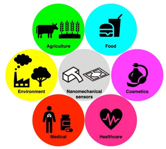 Among a wide variety of chemical sensors, nanomechanical sensors have received significant attention, as they find plenty of applications in many different research fields (Figure 2) [11,24,25,26,27,28,29,30,31,32,33]. In human olfactory perception, it is known that there are approximately 400 different kinds of olfactory receptors [34], which express wide varieties of chemical selectivity, providing unique patterns of odors. To develop artificial olfaction, it is important to construct certain numbers of receptor materials, which have chemical selectivity, to apply multivariate analyses, including pattern recognition. In this context, nanomechanical sensors are one of the ideal sensing platforms for olfactory sensors because of its intrinsic versatility. According to their working principle, nanomechanical sensors detect volume- and/or mass-induced mechanical changes of a sensing element [32]. Since it has been observed that almost all kinds of solid materials, including organic small molecules, polymers, self-assembled nanomaterials, inorganic nanoparticles, and biomolecules, exhibit mechanical deformation upon gas sorption, various types of solid materials can be utilized as a receptor material, providing a wide range of chemical selectivity and sensitivity. Lang et al. reported the first applicability of nanomechanical sensor arrays to the artificial olfaction [35,36,37]. In this review, we aim to summarize the recent studies in the field of olfactory sensing by focusing on nanomechanical sensors. We first address the fundamental research on nanomechanical sensors, including their background theories. We then focus on a specific geometry of nanomechanical sensors with superior performance: a Membrane-type Surface stress Sensor (MSS) [38,39]. Finally, we summarize the recent advances of MSS and their applications as an artificial olfaction.