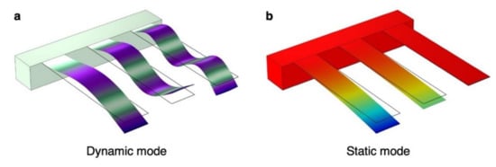 One of the typical geometries of nanomechanical sensors is a cantilever. The cantilever-type sensors can detect two physical parameters: volume and/or mass of target molecules. To measure the volume and mass of target molecules, there are two different operation modes as mentioned above: dynamic and static modes (Figure 3) [32,53,54,55,56,57,58]. While the static mode detects changes in the deformation state of a nanomechanical sensor, the dynamic mode detects changes in the mechanical resonances.