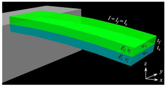 where and are Young’s modulus and Poisson’s ratio of a substrate of a cantilever, respectively (Figure 4). The Stoney’s equation is widely utilized to estimate the deflection of a cantilever beam. According to the Stoney’s equation with the relations of constant curvature [73,74], where is the length of the cantilever plate, as well as the conversion of three-dimensional internal stress to two-dimensional surface stress as