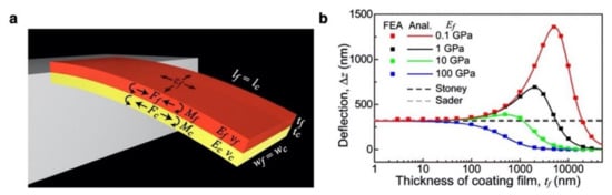 and Equation (2) into Equation (9), the deflection of a cantilever can be described as a function of surface stress . In the case of , Equation (9) reduces to the Stoney’s equation in Equation (3). As clearly seen in Figure 5b, the derived equation well expresses the dependence of the thickness and the coating film properties, while the Stoney’s equation only covers the case of .