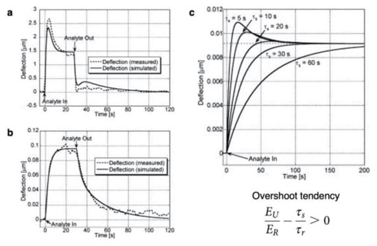 The analytical solution of the absorption process can be expressed as a typical first-order response; however, most of the signal responses from the nanomechanical sensing do not follow the above derived equation because a large number of receptor materials exhibit viscoelastic behavior. The viscoelastic properties arise from dynamic differences on molecular rearrangements [97]. To overcome this problem, Wenzel et al. proposed a theoretical model for a cantilever-type nanomechanical sensor coated with a viscoelastic material [95]. The theoretical models are derived from the simplest three-parameter solid model [95,98]:
