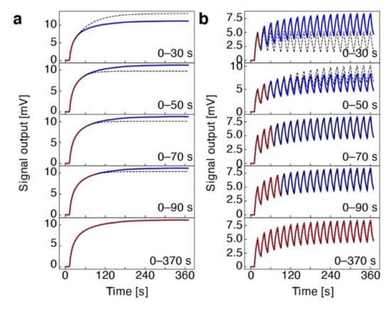 It should be noted that the derived equation based on Wenzel’s model can be utilized for extracting fitting parameters by using a signal response, which reaches the steady state or equilibrium state. However, when the measured signal response does not reach the steady state, the parameters extracted from the experimental results cannot predict the entire signal responses (Figure 7a). Recently, Minami et al. extended the analytical solution based on Wenzel’s model to the multistep injection–purge cycle system, which can be effectively utilized to predict and/or analyze the signal responses of a nanomechanical sensor without measuring the signal until it reaches the steady state [96]. In nanomechanical sensing, the multistep injection–purge cycles are often used to obtain repetitive signal patterns (Figure 7b). For the derivation of the multistep injection–purge cycles, they considered a rectangular pulse wave-like sequence, in which the concentration of an analyte in the gas phase can be described as a step function:
