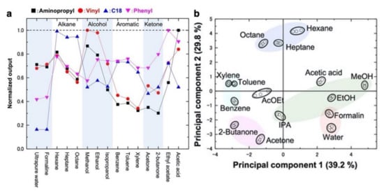 Wide varieties of chemical selectivity obtained from the surface functionalized silica-titania hybrid nanoparticles (STNPs). (a) Affinity trend of four different types of STNPs. (b) PCA scatter plot of 15 different chemicals shown in (a) by using the extracted features from four STNPs bearing different surface functionalities. Reprinted from Ref. [8], the authors licensed under CC-BY 4.0.