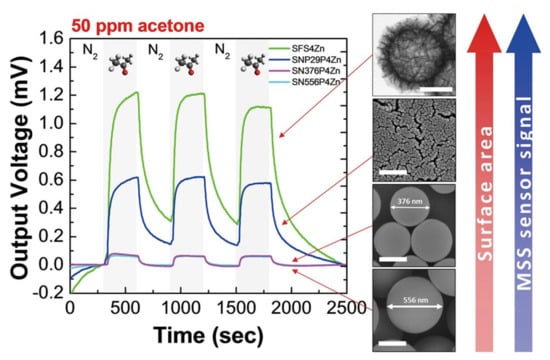 In contrast to the surface functionality of the nanoparticles, surface area is also an important feature of nanoparticles. By changing the sizes as well as the shapes of nanoparticles, it is possible to tune their surface area. Osica et al. synthesized silica nanoparticles whose diameters are 29, 376, and 556 nm, and coated them on MSS membranes [139]. The resulting silica nanoparticles with a larger diameter give lower signal responses because of the lower surface area, while the nanoparticles with 29 nm in diameter yielded high signal responses upon exposure to 50 ppm acetone vapor (Figure 11). Interestingly, Oscia et al. also synthesized surface nanostructured silica nanoparticles [139], i.e., a so-called silica flake–shell, which is reported by Ji et al. [140,141]. Although the size of the silica flake–shell nanoparticles is similar to that of 556 nm-sized solid silica nanoparticles, the flake–shell nanoparticles-coated MSS obtains the highest signal response to 50 ppm acetone, owing to the high surface area of the flake–shell nanoparticles [139].