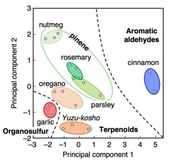 One of the key applications of artificial olfaction is to identify smells similarly to a human nose. As mentioned earlier, people identify smells through pattern recognition derived from c.a. 400 different types of olfactory receptors (Figure 1). By using this pattern recognition analysis with an array of MSS, various target analytes can be identified [8,143]. As an example of a practical application, Imamura et al. demonstrated the identification of spices and herbs [144]. They used commercially available polymers, i.e., PMMA, PAH, and PVP (see also Table 1) as receptor layers of MSS and the resulting MSS array was exposed to various vapors of spices and herbs (i.e., cinnamon, parsley, nutmeg, peppers, Yuzukosho (citrus-flavored pepper; one of the Japanese spices), oregano, garlic, and rosemary). By applying PCA, they distinguished each spice and herb as well as classified them into three major groups related to their major components, such as their terpenes and terpenoids, organosulfurs, and aromatic aldehydes (Figure 12) [144].