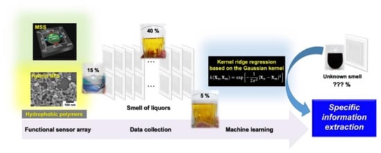 One of the representative applications of artificial olfaction is the quantification of a target analyte in a certain smell composed of a complex mixture of gaseous molecules. A chromatographic approach is a straightforward way to quantitatively analyze smells; however, it is time consuming and requires trained operators. A pattern recognition approach is useful for distinguishing a sample from others, as described above. In addition to the discrimination, the possibilities of the quantification through the pattern recognition analysis were investigated on the basis of the multiple sensor responses [150], whereas it has been experimentally demonstrated that it is practically impossible to extract specific values directly and quantitatively from a complex sample with three or more components by a conventional approach. Shiba et al. demonstrated that an array of MSS combined with a machine learning regression technique can derive quantitative information from the smells; in this case, alcohol contents in various liquors (Figure 16) as an example [8]. The surfaces of MSS membranes were coated with four different receptor materials and 35 liquid samples, including water, teas, liquors, and water/ethanol mixtures, were exposed to the MSS array to obtain the signal responses. The MSS signals were then processed by using kernel ridge regression. From the prediction accuracies of machine learning, it is found that the hydrophobic receptor materials are useful for the prediction of an alcohol content. Using four types of hydrophobic materials, they succeeded in quantifying the alcohol contents of not only known liquors, which is used for constructing a machine learning model as a training dataset (represented as blue open circles in Figure 17), but also unknown liquors including red wine, Imo-shochu (spirits distilled from sweet potatoes), and whisky, that were not used to train the prediction model (represented as red solid circles in Figure 17). Very recently, the Asahi Kasei Corporation in collaboration with Japanese Sake Brewery, Yoshinogawa Co., Ltd. has demonstrated the quantification of alcohol content through the odors of Japanese sake during the sake brewing process [151] and is accelerating its efforts toward a social implementation of MSS-based artificial olfaction. Moreover, Shiba et al. also reported another quantitative analysis using MSS based on the machine learning approach [9]. They measured vapors of a ternary mixture consisting of water, methanol, and ethanol. From the obtained MSS signals, they constructed prediction models based on Gaussian process regression, resulting in the successful estimation of the concentration of each component. In addition, this research was started with six types of surface functionality-bearing nanoparticles as receptor materials. From the machine learning results, it was found that receptors with a mixture of alkyl (C18) and amine (NH2) functionalities are important, and by developing new nanoparticles with varying the mixture of these functionalities, high prediction accuracy was achieved. In other words, data-driven analysis has provided a guideline for material development. This ternary mixture is one of the model systems that simulate a practical situation; a target is coexisting with a structurally similar species (i.e., methanol and ethanol) under humidified conditions. These successful quantification approaches are potentially applied to deriving a variety of information from any complicated samples, and hence can be adopted as a quantitative odor analysis method in a practical situation in various fields, such as food, agriculture, cosmetics, environment, healthcare, and medicine.