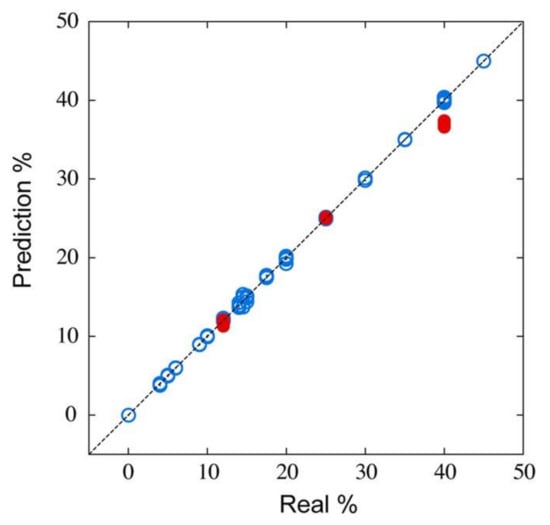 Parity plot of predicted alcohol content versus real alcohol content under an ambient condition. The blue open circles represent the known liquors which are used to train the machine learning model. The red solid circles are the unknown liquors: red wine (12%), Imo-shochu (25%), and whisky (40%). Reprinted from Ref. [8], the author licensed under CC-BY 4.0.