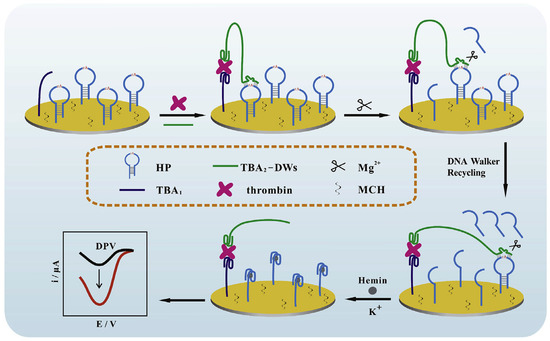 A modified signal-on electrochemical aptasensor was developed based on the DNAzyme-driven DNA walker method for the rapid identification of TB. DNA walkers are nanoscale molecular systems composed of greatly programmable DNA self-assemble that can commutate chemical energy into mechanical, thus leading to signal amplification. In this aptasensor, the double operative hairpin DNA (HP) was designed with a substrate sequence of the Mg2+ dependent DNAzyme (to afford the DNA walkers’ driving force) and G-quadruplex forming fragment (to induce an impressively current response by binding hemin). The binding of TB with the aptamers created a sandwich construction when TB and DNA walker were added to the modified electrode. Then, the DNA walker could frequently bind and split HP with the aid of Mg2+ and unlock many active G-quadruplex sequences. Finally, hemin can connect to the G-quadruplex to construct G-quadruplex/hemin complexes, which leads to improved current efficiency measured through DPV [46]. The process of this DNA walker amplification strategy-based aptasensor is represented in Figure 1.