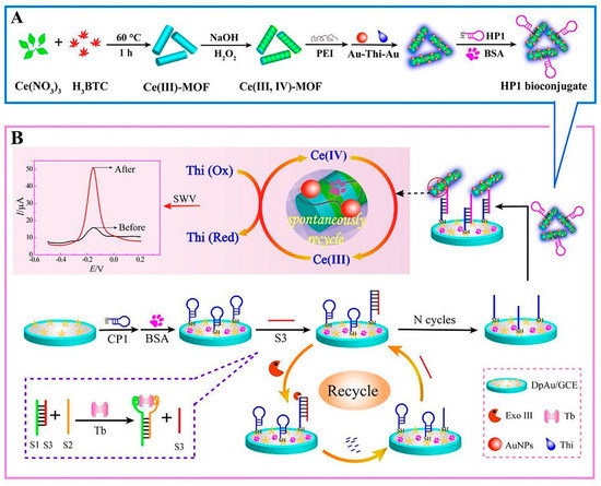 MOF-voltammetric aptasensor for TB determination: (A) Construction steps of HP1 bioconjugate (HP1/Au-Thi-Au@Ce (III, IV)-MOF), and (B) the manufacturing process of the Ce (III, IV)-MOF electrocatalyst with Exo III-assisted recycling amplification [49].
