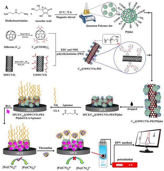 Carbon-based materials such as multi-walled carbon nanotubes (MWCNTs) and fullerene (C60) have been applied to construct biosensors. These materials render mechanical constancy, a great surface-to-volume ratio, low cost, electrocatalytic characteristics etc. [56,57,58,59,60]. Specifically, Jamei et al. fabricated an ultra-sensitive aptasensor based on polymer quantum dots and a C60/MWCNT polyethyleneimine (PEI) nanocomposite modified on the SPCE electrode surface to analyze TB (Figure 3). The presence of a high number of amine groups in the PEI composition assisted in the stabilization of biological molecules on the aptasensor. By connecting TB to the surface of the SPCE/C60/MWCNT PEI/PQdot/GLA/APT aptasensor, electron transfer was limited, and the analytical signal decreased in proportion to the TB concentration [59].