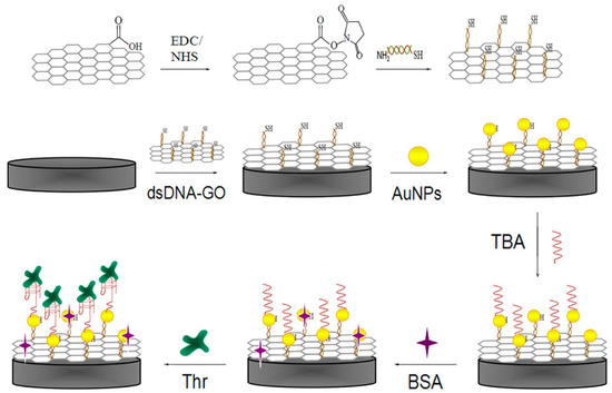 Graphene oxide (GO), as a two-dimensional carbonaceous nanomaterial, has appropriate chemical and physical features such as a large surface area to volume ratio, high electrical conductivity, simple operation, ability to disperse evenly in pure water, etc. [63]. Therefore, an effective electrochemical impedance aptasensor, based on a AuNPs/dsDNA-GO nanocomposite, was designed for TB determination. In this system, as shown in Figure 4, GO was functionalized with dsDNA through an amidation reaction, and AuNPs were electrodeposited onto the dsDNA-GO to promote electrode efficiency. Ultimately, TBA captures TB molecules and causes an increase in the charge transfer resistance [64].