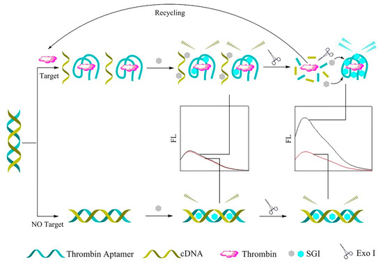 - Chen, X.; Li, T.; Tu, X.; Luo, L. Label-Free Fluorescent Aptasensor for Thrombin Detection Based on Exonuclease I Assisted Target Recycling and SYBR Green I Aided Signal Amplification. Sens. Actuators B Chem. 2018, 265, 98–103. [Google Scholar] [CrossRef]