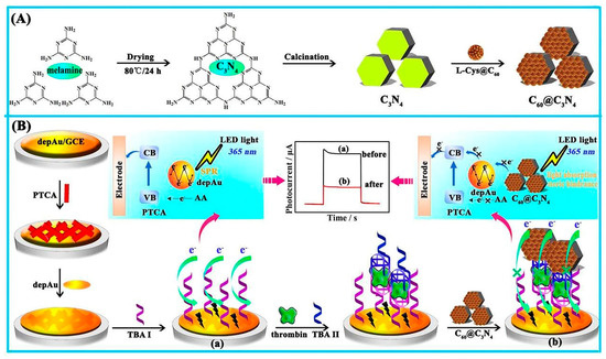 The photoelectrochemical aptasensor for TB determination. (A) The synthesis of C60@C3N4 nanocomposites, and (B) the signal-off PEC aptasensor fabrication mechanism [128].
