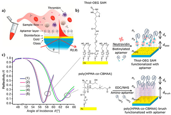 SPR is another optical measuring method that does not demand the use of tagged proteins or fluorescent labels [131]. This technique was used in developing an antifouling polymer brush design and TBA bioreceptors to analyze TB. In this process, as observed in Figure 9, the TBA bioreceptors were effectively anchored on poly[(N-(2-hydroxypropyl)-methacrylamide)-co-(carboxybetaine methacrylamide)] brushes (HPMA-co-CBMAA), which was established on a gold sensor chip through photoinduced single-electron transfer living radical polymerization. Furthermore, to reduce sensor surface blockage by components of the blood samples, antifouling coverings such as self-assembled monolayers (SAMs) containing oligo ethylene glycol chains (OEG) were applied. OEG-SAMs are made up of closely packed requested molecules with short OEG headgroups toward the sample. Subsequently, the specific interaction of the aptamer bioreceptors with TB (and other compounds present in the blood such as HSA, IgG, and prothrombin) was analyzed, and variations in their functionality were reported when integrated into polymer brushes [132].