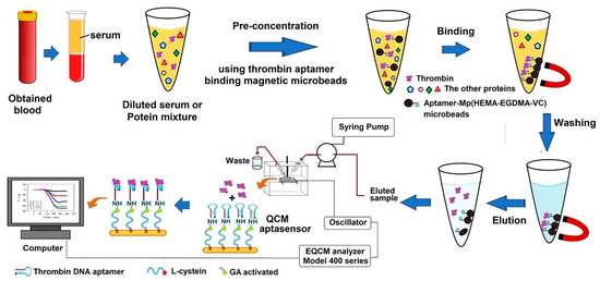 - Bayramoglu, G.; Ozalp, C.; Oztekin, M.; Guler, U.; Salih, B.; Arica, M.Y. Design of an Aptamer-Based Magnetic Adsorbent and Biosensor Systems for Selective and Sensitive Separation and Detection of Thrombin. Talanta 2019, 191, 59–66. [Google Scholar] [CrossRef]