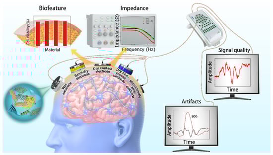 An electroencephalogram (EEG) is a graph of the difference in voltage between brain scalp locations over time. In medicine, EEG signals can not only provide diagnostic evidence for brain diseases but also act as effective rehabilitation equipment to help restore the activities of patients [1,2,3,4]. In terms of engineering applications, utilizing the differences in the EEG signals of sensory, motor, and cognitive activities, EEG can be applied to control or realize projected activities with external devices [5]. Because the EEG signal is nonstationary and random [6], it usually presents low signal intensity and high noise with a typical amplitude of 10–100 µV [7]. Therefore, the development of advanced electrodes to obtain high-quality EEG signals is a very attractive but challenging research topic. The Ag/AgCl wet electrode is usually used with a conductive gel to reduce the electrode–skin impedance for high-quality EEG signals, which has been the gold standard for the real-life recording of brain potentials [8,9]. However, several issues remain to be addressed. First, skin preparation is mandatory for wet electrodes, such as hair cutting (in some cases), decontamination, and electrolyte coating, which are very time-consuming. Additionally, the conductive gel dehydrates and coagulates, leading to a reduction in signal quality after long-term recording. Moreover, it has been observed that gel causes allergic reactions and skin irritation in some patients [9,10]. For BCI, wet electrode-equipped systems not only require a long installation time but are also user-uncomfortable. It lacks the convenience of use, and continuous long-term EEG monitoring needs further investigation. In light of these concerns, designing advanced electrodes is highly desirable. Researchers have been searching for solutions to overcome the challenges of wet electrodes while ensuring good signal quality. Novel semi-dry electrodes, dry contact electrodes, dry non-contact electrodes, and microneedle array electrodes have been reported [11,12,13,14,15,16,17]. However, the configuration features and signal performance remain unclear and have not yet been compared. This review compares the electrode–skin contact performances of these types of EEG electrodes with Ag/AgCl wet electrodes. Combined with the requests of the users and the signal quality, the most suitable electrodes are considered to have the following characteristics: (1) low electrode–skin contact impedance, (2) excellent biocompatibility with good comfort, and (3) high signal quality and small artifacts.