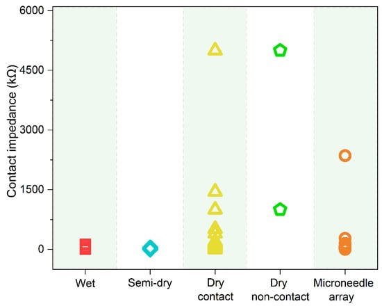 The electrode-skin contact impedance of wet electrodes (Data derived from [52,53,54,55,56,57,58].), semi-dry electrodes (Data derived from [23,37,45,59,61,62,63,64,65,66,67]), dry contact electrodes (Data derived from [39,40,41,44,46,53,55,56,69,70,71,72,73,74,75,76,77,78,79,80,81,82,83,84,85,86,87,88,89,90,91,92,93,94,95,96,97,98]), non-contact electrodes (Data derived from [11,47]) and microneedle array electrodes (Data derived from [25,38,51,52,54,57,58,99,100,101,102,103,104,105,106,107,108,109,110,111,112,113]). Details are in Appendix A Table A2, Table A3, Table A4 and Table A5.