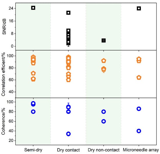 The SNR (black square), signal correlation (yellow diamond), and coherence (blue dots) of semi-dry electrodes (Data derived from [23,27,45,59,63,64,65,66]), dry contact electrodes (Data derived from [39,44,46,53,55,70,72,73,75,76,81,83,85,86,88,89,91,92,94,96,98,116,117,118,119,120,121]), dry non-contact electrodes (Data derived from [11,47,48]) and microneedle array electrodes (Data derived from [57,58,102]), details are in Appendix A Table A2, Table A3, Table A4 and Table A5.