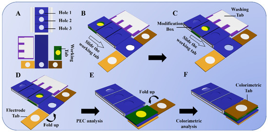 Assembly and operation illustration of the proposed dual-mode lab-on-paper device. (A) Unfolded sensor platform, (B–D) modification process for PWE of the biosensor platform, (E) folding process for PEC detection of target, and (F) folding process for colorimetric detection of target.