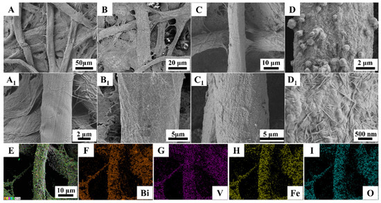 (A,A1) SEM images of bare cellulose fiber with different magnifications. (B,B1) SEM images of cellulose fiber modified with Au NPs. (C,C1) SEM images of paper-based BiVO4 under different magnifications. (D,D1) SEM images of paper-based BiVO4/FeOOH under different magnifications. (E–I) The EDS elemental mapping images for Bi, V, Fe, and O elements.