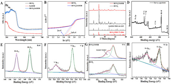 (A) UV-vis absorption spectrum of BiVO4, FeOOH, and BiVO4/FeOOH. (B) The corresponding Tauc plots of (A). (C) XRD patterns of BiVO4, FeOOH, and BiVO4/FeOOH. (D–H) XPS spectrum of the BiVO4/FeOOH nanocomposite.