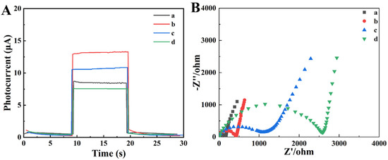 As depicted in Figure 4A, the preparation of BiVO4/FeOOH/Ab/BSA stage by stage was primarily measured based on the photocurrent performances with chronoamperometry under alternate ray illumination. Compared with only BiVO4 (curve a), an obviously more powerful photocurrent of BiVO4/FeOOH (curve b) was exhibited under irradiation, adequately certifying the enhancement of the separation efficiency of the photogenerated carrier transmission resistance and facilitating the charge transfer by the formation of BiVO4/FeOOH composite. After finishing embellishment with Ab and BSA onto the BiVO4/FeOOH, a downward direction of the PEC signal intensity of the prepared photoelectric chemical electrode emerges with BiVO4/FeOOH/Ab (curve c) and BiVO4/FeOOH/Ab/BSA (curve d), on account of the electric insulation of proteins which could restrain sacrificial agent propagation to the BiVO4/FeOOH surface and ulteriorly descend the PEC signal intensity. What is more, the surface state of the proposed PEC biosensor during modification was also following tested ground on electrochemical impedance spectroscopy (EIS). In Figure 4B, the size of the semicircle visually showed the transfer resistance of electrons (Ret). The bare BiVO4 exhibited the smallest semicircle (curve a, Ret = 198.67 Ω) attributed to the higher photoelectric property. With the introduction of FeOOH (curve b, Ret = 487.4 Ω), the Ret increased because of the mean conductivity of semiconductors. After finishing incubation of Ab onto the surface of BiVO4/FeOOH composites, the Ret value enlarged more (curve c) due to the inferior electron transmission capacity. Furthermore, after BSA was introduced to the BiVO4/FeOOH/Ab surface to shield the redundant active sites, the value of Ret sustained an increase (curve d), resulting from the inferior conductivity of the small organic molecule. Consequently, the measured EIS performances of each modification procedure pointed out the successful building of the paper-based PEC device.