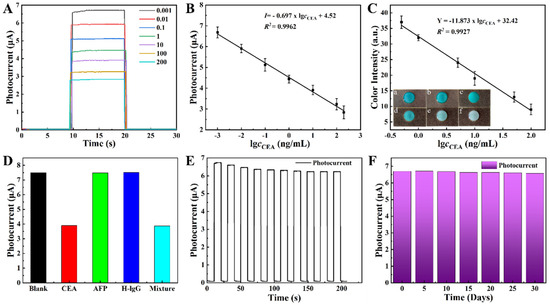 To evaluate the performance of the proposed lab-on-paper device, the experimental optimization conditions of the constructed biosensing platform were first investigated, including pH of electrolyte, and incubation time of CEA, which is shown in the Supplementary Materials (Figure S5). Under the optimized construction conditions, the sensitivity of the proposed lab-on-paper for CEA sensing was employed by performing photocurrent signals and color intensity after incubating CEA of diverse concentrations. As presented in Figure 5A, the photocurrent signals within 10 s-20 s illustrate a reduced trend with CEA concentrations increasing from 0.001 to 200 ng·mL−1 under the optimal condition, which is wider than other reported PEC biosensors (Tables S2 and S3). The linear equation was I = −0.697 × lgcCEA + 4.52 (R2 = 0.9962) and the limit of detection (LOD) was obtained to be 0.0008 ng·mL−1 (Figure 5B). The color intensity exhibited dependence on CEA content in Figure 5C. The linear equation was Y = −11.873 × lgcCEA + 32.42 (R2 = 0.9927), and the LOD was 0.013 ng·mL−1. Meanwhile, the illustration a-f in Figure 5C depicts the processes when the color shifted from blue to pale blue as the CEA concentration increased (0.5–100 ng·mL−1). To evaluate the specificity performance of the proposed PEC platform on CEA sensing, the photocurrent of the fabricated biosensor incubated with different interferents was measured under the same conditions as indicated in Figure 5D. A visibly decreased photocurrent signal with the presence of CEA was obtained and other interfering markers of cancer made no difference on the PEC performance; however, the mixture of CEA, AFP, and H-lgG indicated obvious reduction the same as the presence of CEA, which showed us the proposed sensing platform has excellent specificity for CEA. To evaluate the stability manifestation of the prepared sensor, the photocurrent was recorded under light turned on and off for 200 s (Figure 5D). After 10 light on-and-off cycles, the photocurrent response could still reach 92% of the initial photocurrent, presenting the fine stability of the constructed platform. Additionally, the stability of the proposed lab-on-paper was also investigated after long-term storage. To explore the effectiveness of long-term storage on the constructed biosensor platform, the prepared biosensor was stored at 4 ℃ and their photocurrent ws measured with incubated 0.001 ng·mL−1 CEA every 5 days (Figure 5F). After storing for 30 days, the photocurrent values measured by the constructed biosensing platform could remain at 97% compared to the initial signal value, which further makes clear to us the credible storage stability of the constructed paper-based biosensor.