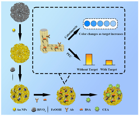 Semiconductor materials, as a typical photoactive material, are normally utilized in the construction of PEC biosensors, because they could generate photogenerated carriers (electron/hole) under external light to achieve photoelectric conversion. In the last few years, various semiconductor materials have served as photoactive materials to construct different kinds of PEC biosensors, for instance, ZnO [19,20], TiO2 [21], CdS [22], Cu2O [23], and WO3 [24]. Among the various semiconductor materials, BiVO4 is considered as a suitable photoanode material because of its suitable band gap (~2.4 eV), high chemical stability, low toxicity, and earth abundance [25,26,27]. However, the photoanode prepared only from BiVO4 has an undesirable photocurrent response due to the limited light absorption, surface charge recombination, and poor electron transfer efficiency [28,29,30,31]. Therefore, it is important to find a material that can improve the PEC response of BiVO4. In order to obtain a higher photocurrent, improvements can be made in the following three aspects: (1) the light absorption range of the photoactive material; (2) the separation efficiency of the photoinduced carriers; and (3) the surface modification engineering of the photoelectrode [32]. Generally, introducing extra material with unique photoactive properties to form a nanocomposite is one of the potential strategies to improve the performance of PEC biosensors [33]. The FeOOH has wide application prospects in many fields because of its merits of environmental friendliness, satisfied photocatalytic activity, low cost, natural abundance, and so on [34]. The modification of FeOOH on the surface of BiVO4 is beneficial to enhance the migration of photoinduced charge, exhibit stronger light response capacity, and reduce the recombination of electron–hole pairs [35,36,37,38]. Moreover, the FeOOH with excellent enzyme-like catalytic activity could catalyze 3,3′,5,5′-tetramethylbenzidine (TMB) to generate blue oxidized TMB [39,40,41]. In this way, colorimetric detection could be integrated with PEC detection to meet the end-user requirement of point-of-care analysis.