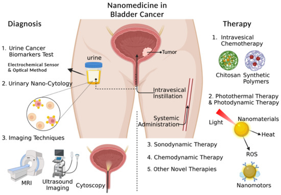 Schematic illustration of nanomedicine in bladder cancer diagnosis and therapy (Created with BioRender.com, access date: 10 December 2022).