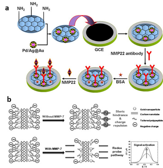 In contrast with eELISA, the label-free electrochemical sensors have the advantages of lower cost and simple fabrication because the use of Ab2 is absent [36,37,38]. Li et al. developed a label-free electrochemical immunosensor applying an Au@Pd/Ag/NH2-Graphene Sheet (GS) to detect the NMP-22 (Figure 3a) [38]. The concentration of NMP-22 is accessed based on the change of the peak current of K3 [Fe(CN)6] after the biomarkers are recognized by the antibodies immobilized on the Au@Pd/Ag/NH2-GS/GCE. Except for the antibodies, molecularly imprinted polymers (MIP) can also be used in the label-free sensor. Lee et al. applied molecularly imprinted poly (ethylene-co-vinyl alcohol) coated zinc oxide nanorods to develop an NMP-22 detection sensor [39]. The biomarkers, which are enzymes, can enzymatically cleave the specific peptides immobilized on the surface of the working electrode; the electron transfer facilitated by the cleavage reaction can be detected [40]. Based on this principle, Palomar et al. developed a label-free electrochemical sensor for the detection of matrix metalloproteinase-7 (MMP-7) (Figure 3b) [40]. The peptides conjugated to the surface of gold nanoparticles (GNPs)/carbon nanotube (CNT)/gold electrode through gold–thiol bonds inhibit the electrochemical signals for the steric hindrance and charge repulsion and their cleavage results in signal activation.