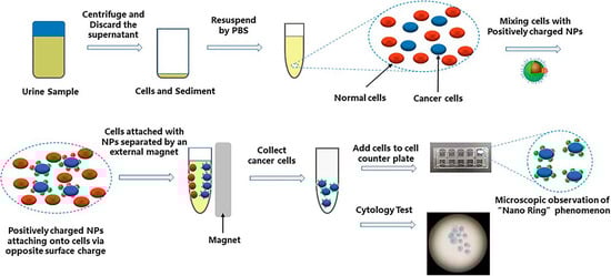 Although lots of urine bladder cancer biomarker tests have been invented, urine cytology is still the only recommended method for the surveillance of bladder cancer under different guidelines [70]. To improve the sensitivity of cytology, Xu et al. mixed the positively charged multifunctional nanoprobes (Fe3O4@SiO2, mNPs) with urine to identify the cancer cells (Figure 7) [71]. A blinded and single-centre clinical trial was performed with urine samples from 102 patients; considering the comparable specificity, simultaneously, nano-cytology may be a new promising assay for the diagnosis of BC. Bladder cancer patients and 49 non-cancer participants were used to compare the sensitivity of the nano-cytology and conventional cytology. The results showed a significantly increased overall sensitivity, which was 82.4% in the nano-cytology group compared with the conventional cytology group, whose sensitivity was 58.8% [71].