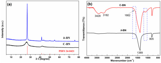 (a) XRD patterns and (b) FTIR spectra of h-BN and C-BN.