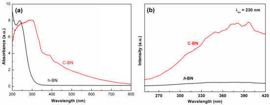 (a) UV–Vis DRS and (b) emission spectra (excited by 230 nm) of C-BN (red curve) and h-BN (black curve).