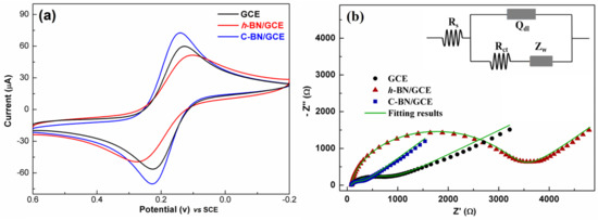 Figure 4a shows the CV response of different electrodes. Each electrode demonstrated a pair of well-defined redox peaks, which resulted from the redox of [Fe(CN)6]3−/4−. Among all the electrodes, C-BN/GCE exhibited the sharpest and highest redox peaks. This reveals that the electron transfer rate of C-BN/GCE is faster than that of the others. In addition, the EASA of the electrode was calculated based on the dependence of the CV on the scan rate (Figure S2a,c,e) using the Randles–Sevcik equation [44]