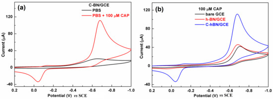 (a) CVs of C-BN/GCE in the absence/presence of 100 μM CAP; (b) CVs of GCE, h-BN/GCE and C-BN/GCE in the presence of 100 µM CAP. (Conditions: 0.2 M PBS with pH of 7.0 at a scan rate of 100 mV/s).