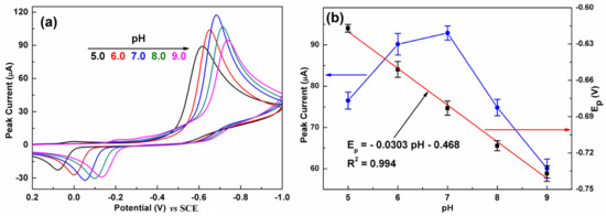 It is well known that the pH of the electrolytes plays an important role in an electrochemical reaction. Figure 7a presents the influence of pH on the CV response of C-BN/GCE toward CAP. The current response gradually increased with increasing pH from 5.0 to 7.0 and then significantly decreased with further increasing pH (Figure 7b, left). Meanwhile, the larger pH value makes the reduction peak potential shift to a more negative direction, implying that protons participated in the electrochemical reaction. As illustrated in Figure 7b (right), the peak potential showed a good linear relationship to pH with a regression equation of Ipc = −0.0303 pH–0.468 (R2 = 0.994). The slope value of −0.0303 V/pH is very close to the theoretical value of −0.059/2 V/pH. Therefore, the electroredox of CAP over C-BN/GCE is an irreversible process involving one electron and two protons, which is consistent with previous reports [45,46]. According to literature [47], the pH value has an impact on the structure of CAP and further on its adsorption on the electrode surface. On the other hand, increasing the pH of the alkaline electrolyte could inhibit the reduction reaction of CAP. As a result, the best current response was achieved at pH 7.0, and was adopted for the later studies. The possible electrochemical reaction mechanism of CAP on C-BN/GCE can be described by Figure S3 [2].