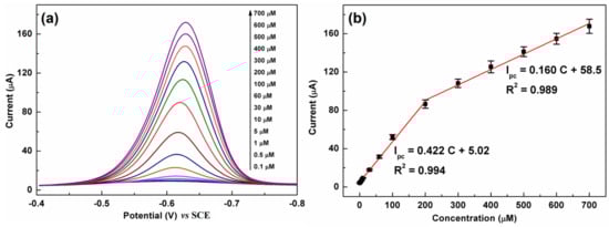 The DPV technique is more effective and sensitive than CV for the quantification of organic substances and thus was employed for CAP detection. Figure 8a shows a series of DPV curves of C-BN/GCE for different CAP concentrations. The current response monotonically increased with increasing CAP concentration from 0.1 µM to 700 µM. Figure 8b illustrates the linear calibration plots between the peak current and concentration. The regression equations can be described as Ipc (µA) = 0.422 C (µM) + 5.02 (R2 = 0.994) in the low concentration region (0.1–200 µM) and Ipc (µA) = 0.160 C (µM) + 58.5 (R2 = 0.989) in the high concentration region (200–700 µM). The limit of detection (LOD) was calculated using the equation LOD = 3σ/S according to the IUPAC definition [18], in which σ is the standard deviation of 5 blank measurements and S is the slope of the calibration plot. The proposed method shows a low LOD of 0.035 µM. The analytical performance of C-BN/GCE was compared with that of other electrodes reported previously. As summarized in Table 1, C-BN/GCE is a suitable platform for CAP detection. Moreover, the construction procedure of C-BN/GCE is facile, and all elements, including carbon, boron, and nitrogen, are earth-abundant.