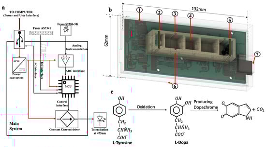 The excitation source and the detector were assembled and mounted on a custom fabricated printed circuit board (PCB) to ensure the light beam was focused within the measurement cavity. These daughter boards were interfaced with the master board to achieve overall system functionality. The master board was designed to have a user interface with a personal computer (PC), power converters, microcontroller for processing, a secondary microcontroller with USB controller, constant current driver for LED excitation, ADC instrumentation, and additional ports. This is indicated in Figure 1a where the user interface to the PC consists of a common interface for both power and data. Fusion 360 CAD software by Autodesk (San Francisco, CA, USA) was used to design the enclosure for the system packaging the master board and the respective daughter boards. Eagle software by Autodesk (San Francisco, CA, USA) was used to design the electronic circuit boards. The complete design is shown in Figure 1b in isometric view, indicating the major parts of the 3D-printed spectrophotometer. There are multiple slots presented across the measurement cavity to test different configurations using optical filters and lenses. The enclosure was 3D-printed using the filament deposition modeling (FDM) technique, and polylactic acid (PLA) used as the filament during fabrication. The gain and the integration time of the detector are the most important configurations for adjusting the sensitivity of the detector. In this experiment, the integration time was set to 2.78 μs and gain to 256× for precise and maximum sensitivity using the software configurations. These measurements were then logged in the computer via USB. Tyrosinase converts the substrate (L-Dopa) into dopachrome (O–Di- quinone) by the hydroxylation and oxidation processes. The chemical equation corresponding to this is shown in Figure 1c. The produced red-colored dopachrome has maximum absorbance at 475 nm. This is captured by the one of the channels from the detector whose center wavelength is at 480 nm and whose full width half maximum is about 36 nm.
