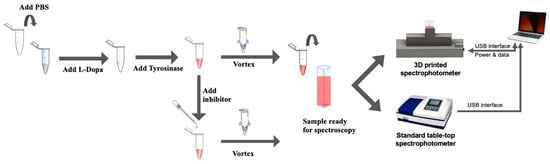 The assay protocol for enzyme kinetics monitoring is shown in Figure 2, indicating the step-wise process of the reaction–mix solution’s preparation and measurement. The 1× PBS was first pipetted into a 5 mL Eppendorf tube, followed by 1 mL of L-Dopa solution, and then followed by the tyrosinase solution (depending on the volume configuration); the solution mixture was then vortexed for about 3 s. The total volume of the reaction–mix solution was 3 mL, which was subsequently pipetted into a cuvette. Respective cuvettes were then placed into a standard table-top spectrophotometer and the 3D-printed spectrophotometer simultaneously for measurement. The computer connected to these instruments logged the absorbance data from both the control instrument and the 3D-printed spectrophotometer over the specified time duration. This is repeated for all combinations of tyrosinase volume concentrations to study the reaction kinetics at different reaction rates.