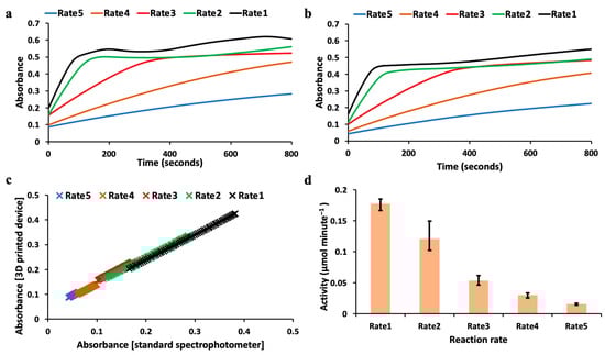 Enzyme kinetics measured at different reaction rates using the 3D-printed spectrophotometer and reference spectrophotometer are indicated. (a). Enzyme kinetics (average absorbance value vs. time) monitored using the reference table-top spectrophotometer. (b). Enzyme kinetics (average absorbance value vs. time) monitored using the 3D-printed spectrophotometer. (c). Correlation plots between the reference table-top spectrophotometer and the 3D printed spectrophotometer for the kinetics activity monitored at different reaction rates. Rate 1: y = 0.87 ∗ x; R2 = 0.9995; Rate 2: y = 0.81 ∗ x; R2 = 0.9981; Rate 3: y = 0.71 ∗ x; R2 = 0.9984; Rate 4: y = 0.66 ∗ x; R2 = 0.9977; Rate 5: y = 0.53 ∗ x; R2 = 0.9978; (d) Activity calculated using the 3D-printed spectrophotometer at different reaction kinetics rates with error bars. All measurements were done in triplicate.