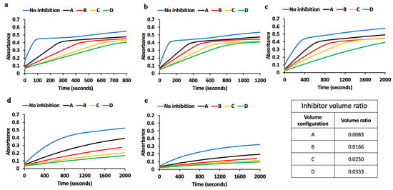 Enzyme kinetics measured using the 3D-printed spectrophotometer without inhibition and with different degrees of inhibition (controlled by the volume concentration of the inhibitor shown in the inset table). (a) Enzyme kinetics monitored at Rate1 being the fastest rate and at a different volume concentration of the inhibitor. (b) Enzyme kinetics monitored at Rate2 without inhibition and at a different volume concentration of the inhibitor. (c) Enzyme kinetics monitored at Rate3 without inhibition and at a different volume concentration of the inhibitor to inhibit the enzyme activity. (d) Enzyme kinetics monitored at Rate4 without inhibition and at a different volume concentration of the inhibitor to inhibit the enzyme activity. (e) Enzyme kinetics monitored at Rate5 being the slowest without inhibition and at a different volume concentration of the inhibitor to inhibit the enzyme activity. The table indicates different volume ratios of kojic acid used in the 3 mL reaction–mix solution.